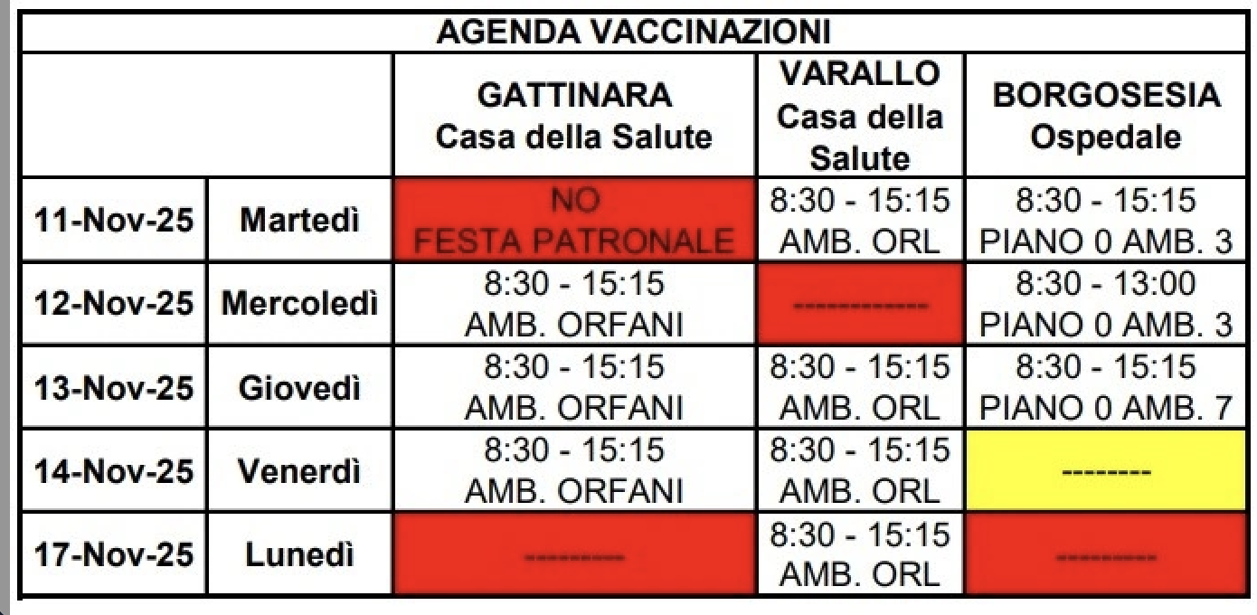 Di seguito la tabella con indicazione di sedi e orari delle vaccinazioni: