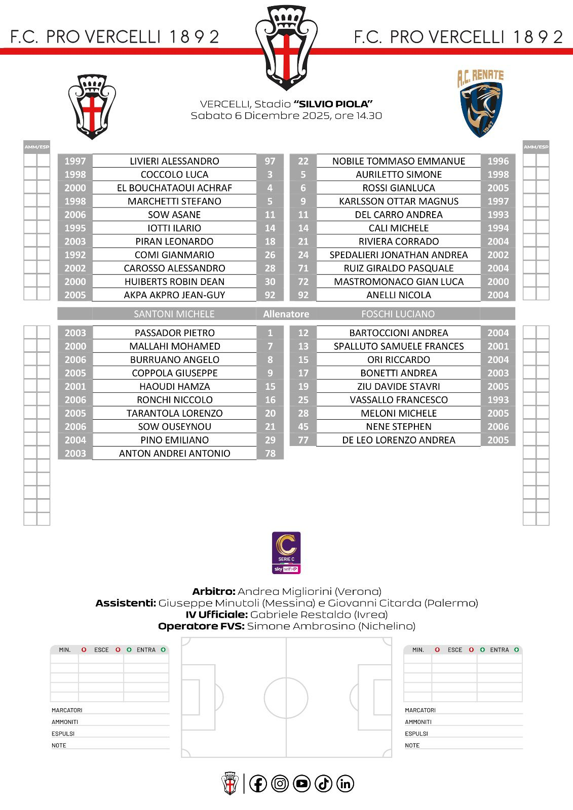 Pro vs Renate, sabato 6 dicembre, Stadio Robbiano Piola, arbitro Domenico Castellone di Napoli, assistenti Carmine De Vito di Napoli e Marco Munitello di Gradisca d’Isonzo, quarto uomo Leonardo Leorsini di Terni. Giornata di sole e freddo. Le formazioni🔽