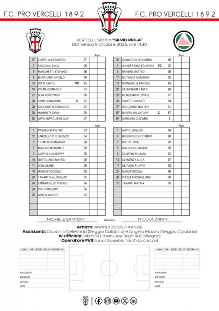 Pro vs Dolomiti Bellunesi, domenica 5 ottobre al Robbiano Piola, 978 spettatori, arbitro Andrea Zoppi della sezione di Firenze, ottava giornata del campionato 2025/2026 di Lega Pro, assistenti Giovanni Celestino di Reggio Calabria e Angelo Mazza di Reggio Calabria, quarto uomo Vittorio Emanuele Teghille di Collegno, operatore FVS Ionut Eusebiu Nechita di Lecco. Ci sono anche i tifosi bellunesi nel settore dedicato, a loro è stato offerto un piatto di panissa grazie alla condotta Slow Food di Vercelli ed allo chef Fabio Villa dell’Osteria Vecchio Asilo, in previsione dei Panissa days 10-11-12 ottobre a Vercelli e dintorni! ☺️ Le formazioni🔽