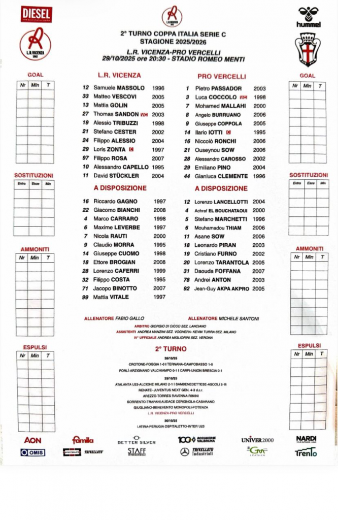 Vicenza vs Pro, gara di coppa Italia di Lega Pro in serale allo stadio Menti, lunedì 29 ottobre, arbitro Giorgio Di Cicco di Lanciano, assistenti Andrea Manzini di Voghera e Kevin Turra di Milano, quarto ufficiale Andrea Migliorini di Verona. Vediamo le formazioni🔽
