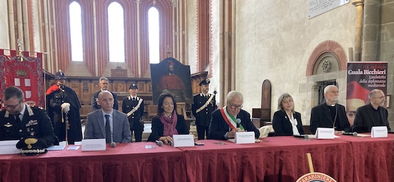 L’Arcivescovo, monsignor Marco Arnolfo, ha voluto esprimere «il vivo compiacimento al Sindaco per aver scelto questa splendida basilica per celebrare l’evento. È proprio qui infatti che riposano le spoglie mortali di colui che, otto secoli fa, ha pensato, finanziato e consacrato l’edificio sacro che – con le sue guglie, il suo tiburio e i suoi rosoni – rappresenta la nostra città nel mondo. Al Cardinale Bicchieri, il più illustre mecenate della storia vercellese, nell’accorto intreccio tra sapienza umana, competenza teologica e rigore diplomatico, si riconosce, oltre al determinante contributo per la stesura della Magna Charta Libertatum nell’Inghilterra duecentesca dei Plantageneti, anche la paternità di questa Chiesa e dell’attiguo ospedale. A distanza di otto secoli, è ancora oggi non solo un esempio di ecclesiastico virtuoso e brillante, ma soprattutto di un uomo di fede e di dottrina, che ha saputo dare forma ad opere di carità materiale e altre, non meno importanti, di carità intellettuale e spirituale». La riconsegna della tela del Carindale per l’Arcivescovo è stato «un momento solenne ed insieme un tributo doveroso verso un illustre figlio della Chiesa eusebiana, che ha scritto una pagina indelebile della nostra storia».