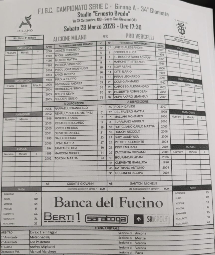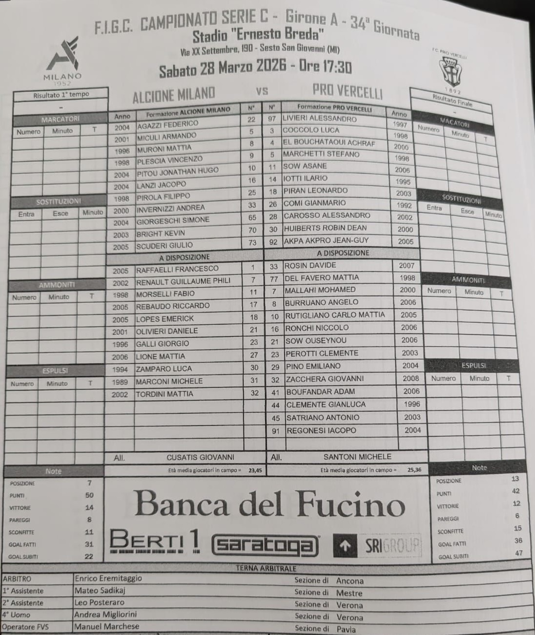 Alcione vs Pro, Stadio Ernesto Breda di Sesto San Giovanni, sabato 28 marzo 2026 ore 17.30, arbitro Enrico Eremitaggio della sezione di Ancona, 34° giornata del campionato 2025/2026 di Serie C, assistenti Mateo Sadikaj di Mestre e Leo Posteraro di Verona, quarto uomo Andrea Migliorini di Verona, operatore FVS Manuel Marchese di Pavia. Cinque giornate alla fine della Stagione Regolare, prima delle appendici di play off e play out. Grazie a Stefano Zanello per le sempre bellissime immagini.