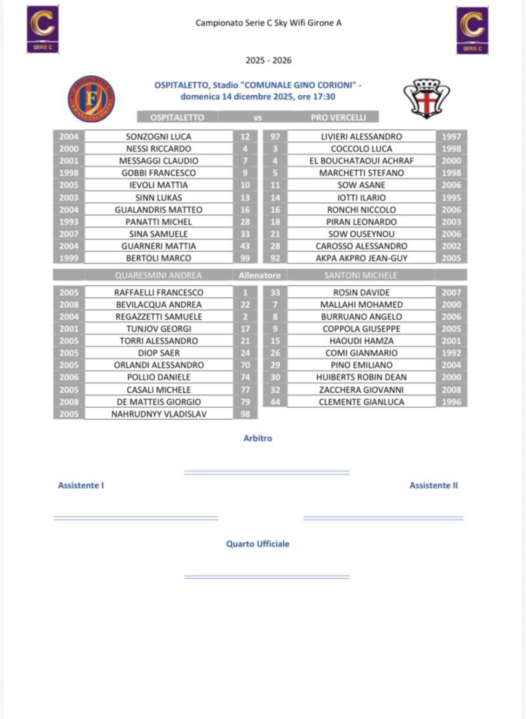Ospitaletto vs Pro, domenica 14 dicembre 2025, arbitro Andrea Cappai di Cagliari, assistenti Marco Sicurello di Seregno e Silvia Scipione di Firenze, quarto uomo Jules Roland Andeng Tona Mbei di Cuneo, stadio Gino Corioni, ore 17.30.