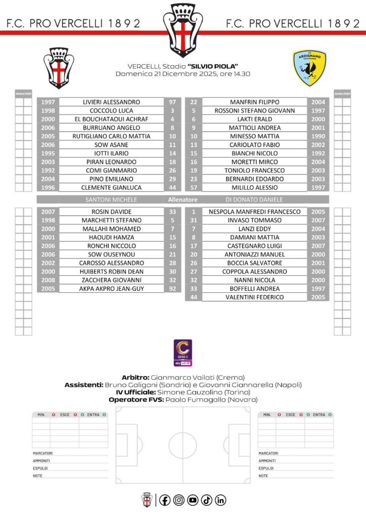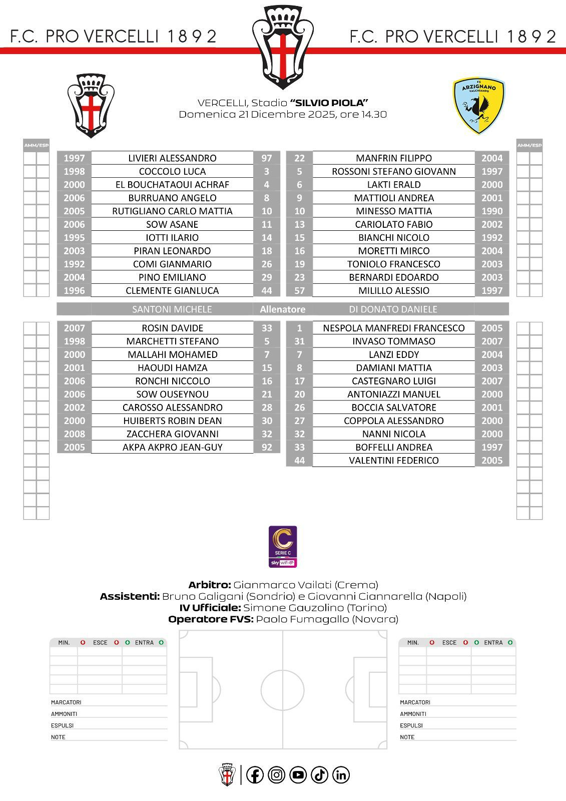 Pro vs Arzignano, ultima giornata del girone di andata di serie C girone A, stadio Robbiano Piola ore 14.30 di domenica 21 dicembre 2025, arbitro Gian Marco Vailati di Crema, assistito da Bruno Galigani di Sondrio e Giovanni Ciannarella di Napoli, il quarto uomo è Simone Gauzolino di Torino, operatore FVS Paolo Fumagallo di Novara. Grazie a Stefano Zanello per le foto sempre bellissime!