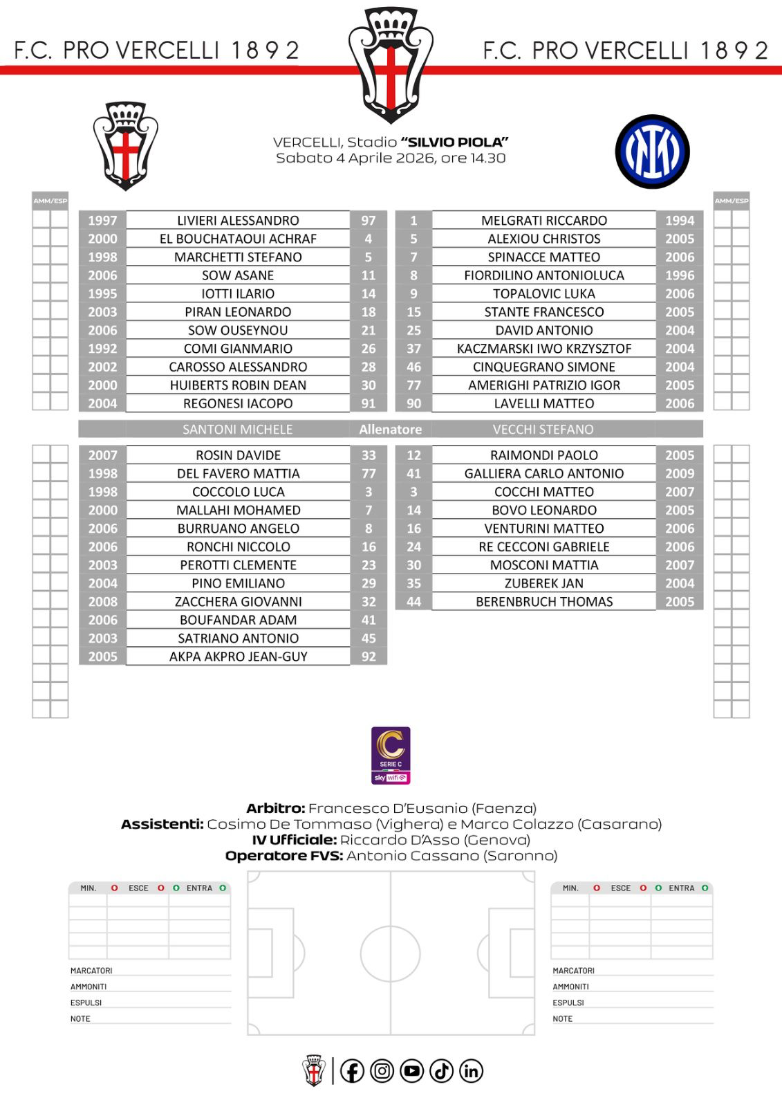 Pro vs Inter Under 23, arbitro Francesco D’Eusanio della sezione di Faenza, assistenti Cosimo De Tommaso di Voghera e Marco Colazzo di Casarano, Quarto uomo Riccardo Dasso di Genova, operatore FVS Alessandro Cassano di Saronno. Assenti gli Ultras in Curva Ovest per la protesta contro le squadre B di serie A che snaturano il campionato di serie C. Naturalmente deserto il settore ospiti. Inter che proviene da tre sconfitte di fila. Grazie a Gil ed a Stefano Zanello per le bellissime foto. Le formazioni 🔽