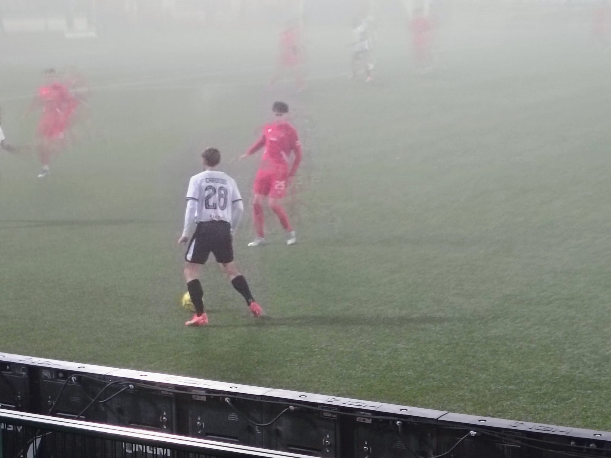 Fa freddo, freddissimo alle 17.30 al Robbiano Piola, poco sopra i due gradi centigradi, nella Pro Patria gioca Alberto Masi, indimenticato ex. Assenti nella Pro Pino per una botta in allenamento e Passador. Negli ospiti assenti Motolese, Reggiori e Di Munno. Mister Francesco Bolzoni ha preso il posto nei bustocchi di Leandro Greco. La nebbia incombe. Un minuto di silenzio per le vittime di Crans Montana. Nei primi minuti di gara, per quel che si può vedere attraverso la nebbia, la Pro Patria è propositiva, la Pro tenta qualche affondo ma gli ospiti contengono con facilità le offensive bianche ed anche il possesso palla della squadra di mister Santoni è spesso imperfetto per errori in palleggio. Al 15’ Coccolo di testa su azione conseguente a corner spedisce alto sopra la traversa, un quarto d’ora avaro di emozioni, i brividi sono di freddo per il caratteristico tempo da Robbiano, siamo a un grado centigrado. Intorno al 20’ la Pro sembra scuotersi ma la conclusione di Burruano è facile preda di Rovida. Al 24’ botta di Carosso con il mancino, Rovida vola e devia in calcio d’angolo. Ammonito al 28’ Masi per fallo su Comi. Al 41’ s’intravede un cross in area piccola di Comi verso Iotti che di testa impegna Rovida in una difficile respinta in corner. Tre minuti di recupero ed il primo tempo finisce 0 a 0.