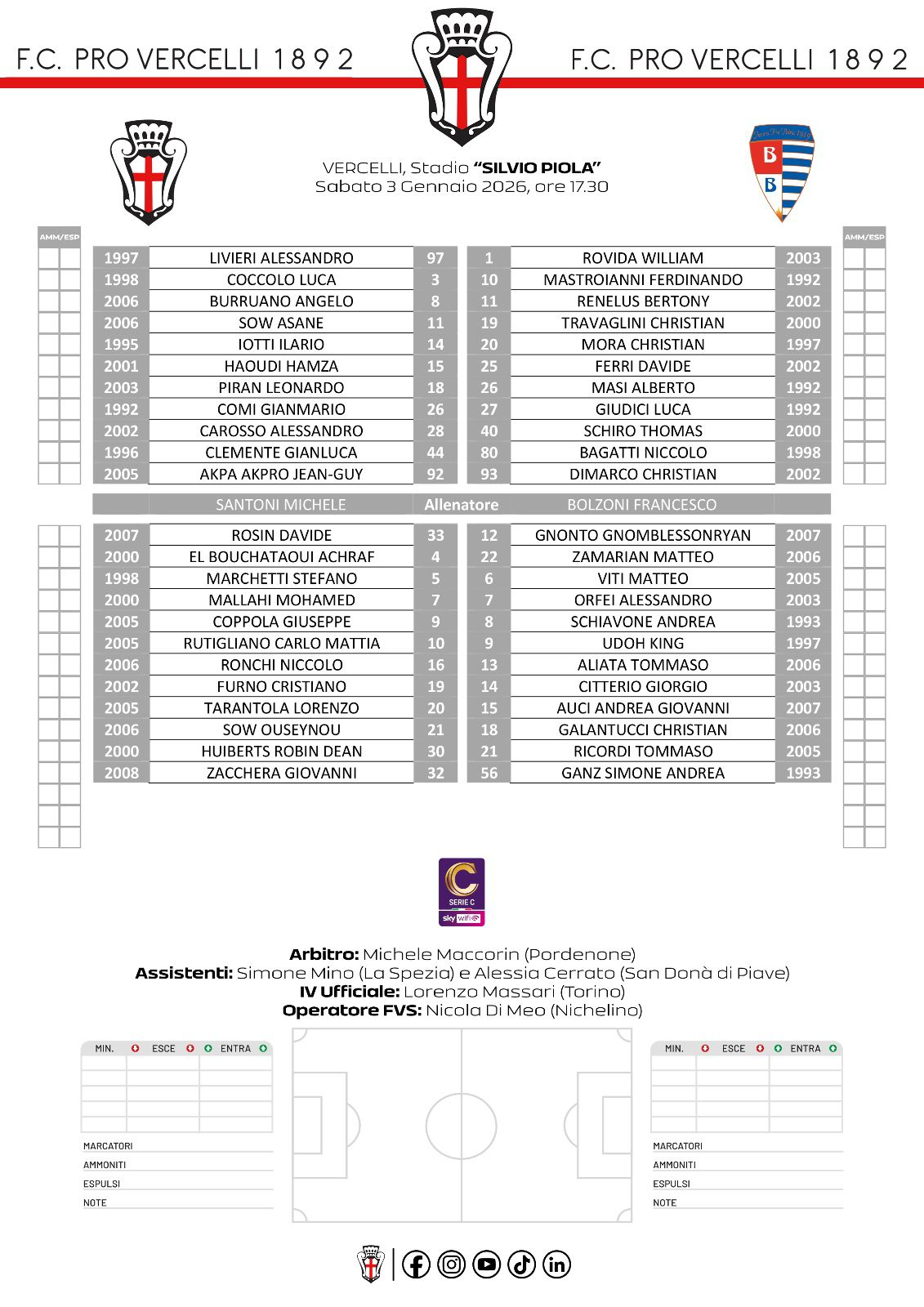 Pro Vercelli vs Pro Patria, 3 gennaio 2026, Stadio Robbiano Piola ore 17.30, arbitro Michele Maccorin di Pordenone, assistenti Simone Mino di La Spezia ed Alessia Cerrato di San Donà di Piave, quarto uomo Lorenzo Massari di Torino, operatore FVS Nicola Di Meo di Nichelino. Una sfida che sa di antico, tra Leoni e Tigrotti, padroni di casa chiamati al riscatto, bustocchi alla ricerca di punti salvezza. È la prima giornata di ritorno, all’andata la Pro vinse tre a due. Grazie all’amico Stefano ed al club Forza Pro per le sempre bellissime foto 🙏