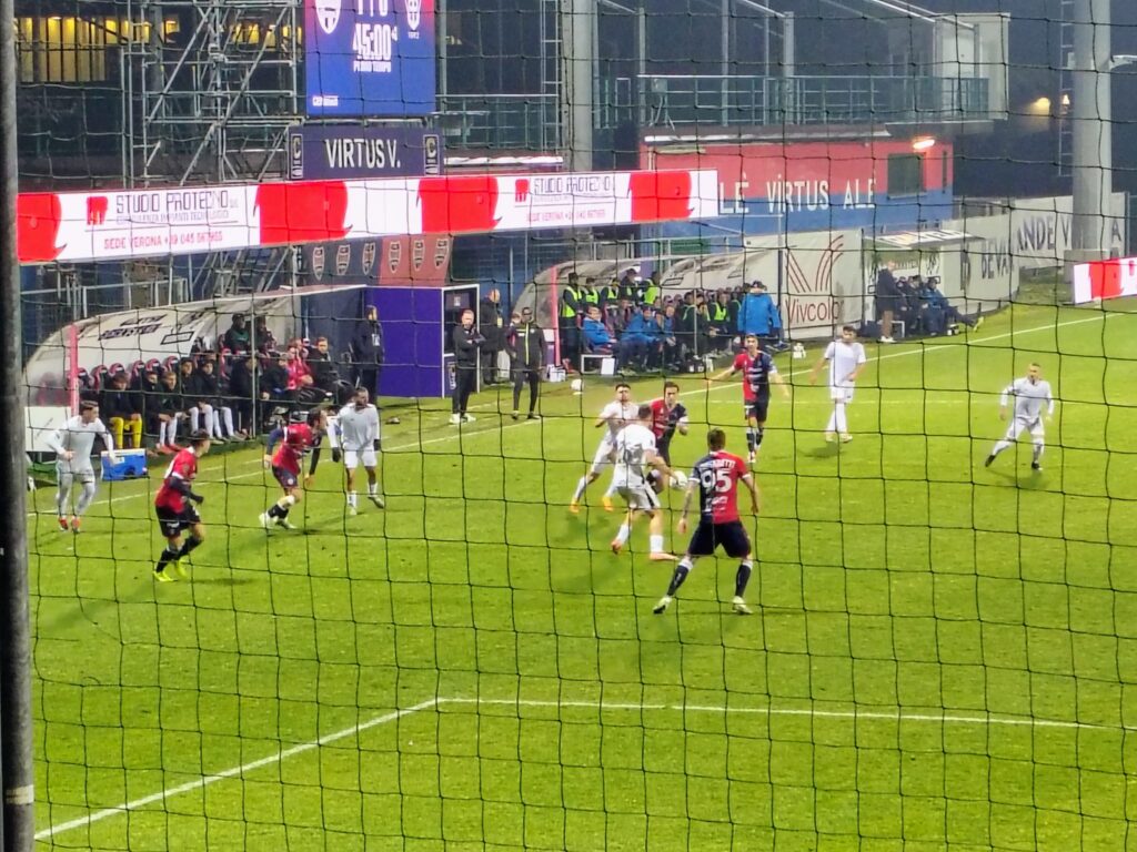 Serata nuvolosa e umida, 8 gradi. Terreno in erba naturale in buone condizioni, insidioso per la pioggia caduta nel pomeriggio. Spettatori 250 circa di cui 26 vercellesi nel settore ospiti. Fuori Livieri ed Huiberts per infortunio, esordio di Del Favero, ritorna Rutigliano dal primo minuto. Primo tentativo verso la porta avversaria è di Burruano che ci prova con uno spiovente di 25 metri, alto di poco sulla traversa. E al terzo minuto la Virtus Verona va in vantaggio con Cernigoi che dal limite si libera di Clemente e di sinistro buca Del Favero. La Pro tenta di reagire fin da subito ma è durissima. Ed all’ottavo minuto Cernigoi sfiora la doppietta con una rovesciata volante in area su cross dalla destra offensiva. La Virtus Verona in questo campionato non ha mai vinto tra le mura amiche. Ma i padroni di casa continuano a macinare gioco, la Pro fatica. Al 14’ ancora Cernigoi superstar, dalla distanza breve Del Favero respinge, un minuto dopo Fabbro segna da due passi ma è in fuorigioco. Pro in bambola pesante. Ammonito al 23’ Bassi per fallo su Comi. Alla mezz’ora Rutigliano tenta il tiro da fuori , deviato da un difensore, la palla si stampa sulla traversa. Al 35’ Fabbro di mancino tenta la botta, centrale, Del Favero alza in corner. Ammonito al 40’ Sow per gioco falloso. Al 44’ rigore per la Virtus, braccio di Burruano su carambola in area Pro. La Pro chiede l’FVS ed il rigore viene annullato. Tre minuti di recupero, il primo tempo finisce uno a zero per la Virtus.
