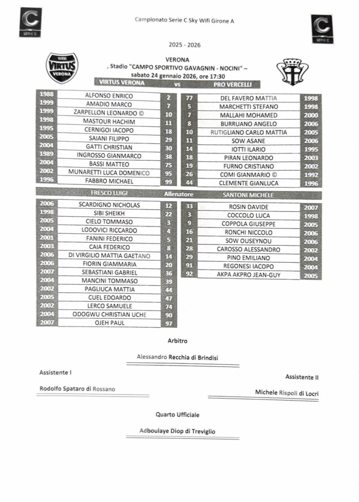 Virtus Verona vs Pro, Stadio Gavagnin Nocini, zona di Borgo Venezia, sabato 24 gennaio ore 17.30, ventitreesima giornata del campionato di serie C girone A. Trasferta insidiosa, come tutte per la Pro, contro una Virtus impegnata nella spasmodica lotta per evitare i play out. Arbitro Alessandro Recchia della sezione di Brindisi, assistenti Rodolfo Spataro di Rossano e Michele Rispoli di Locri, quarto uomo Abdoulaye Diop di Treviglio e operatore FVS Giovanni Pandolfo di Castelfranco Veneto. Imponente galleria di immagini, grazie agli amici Gil, Stefano ed al Club Forza Pro.